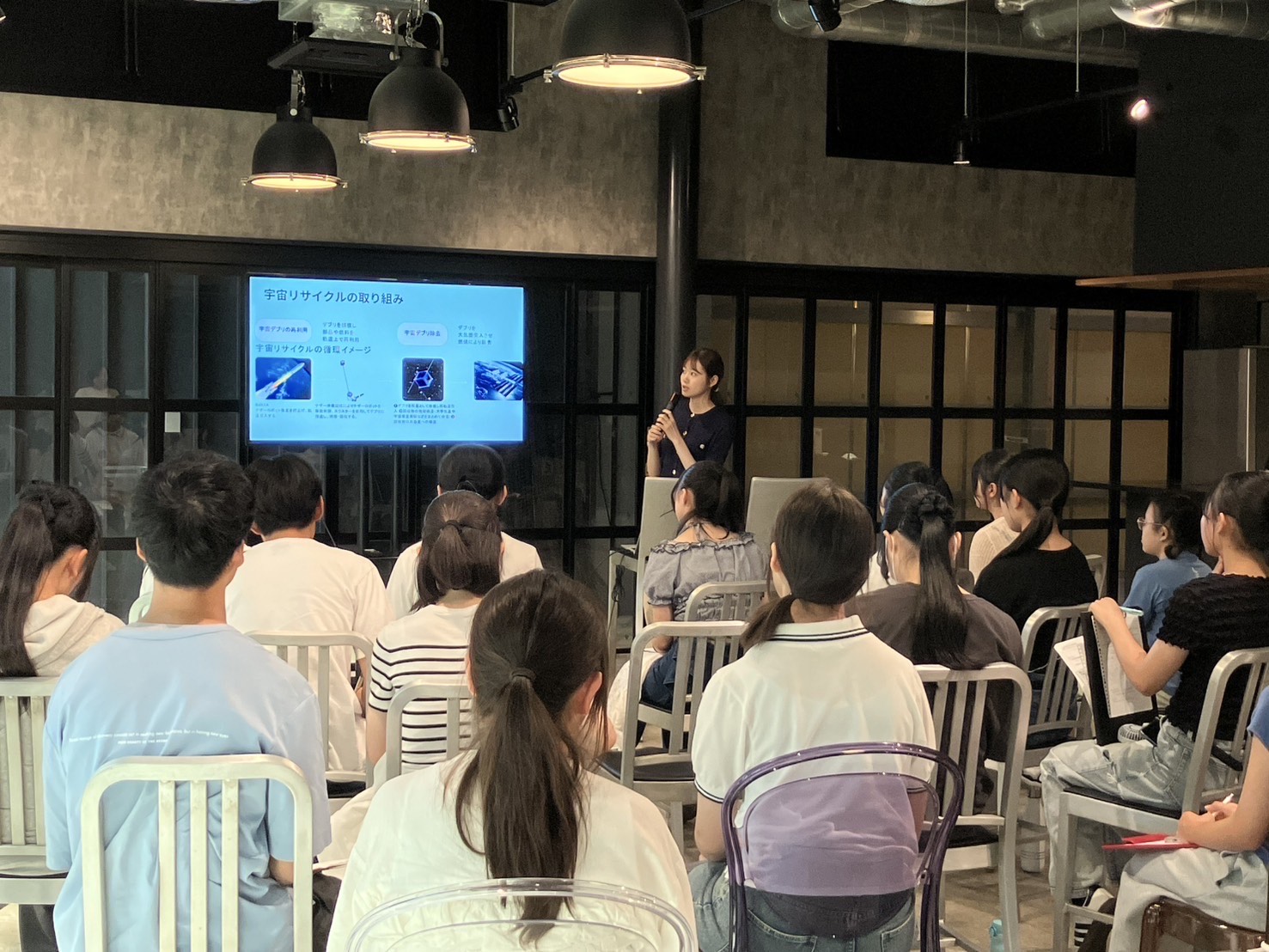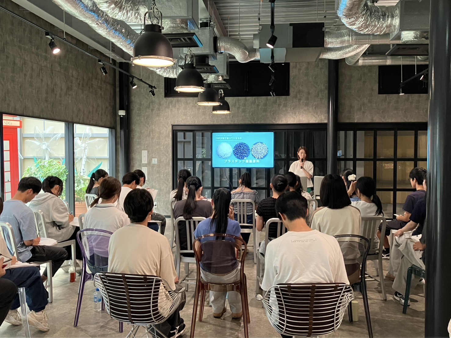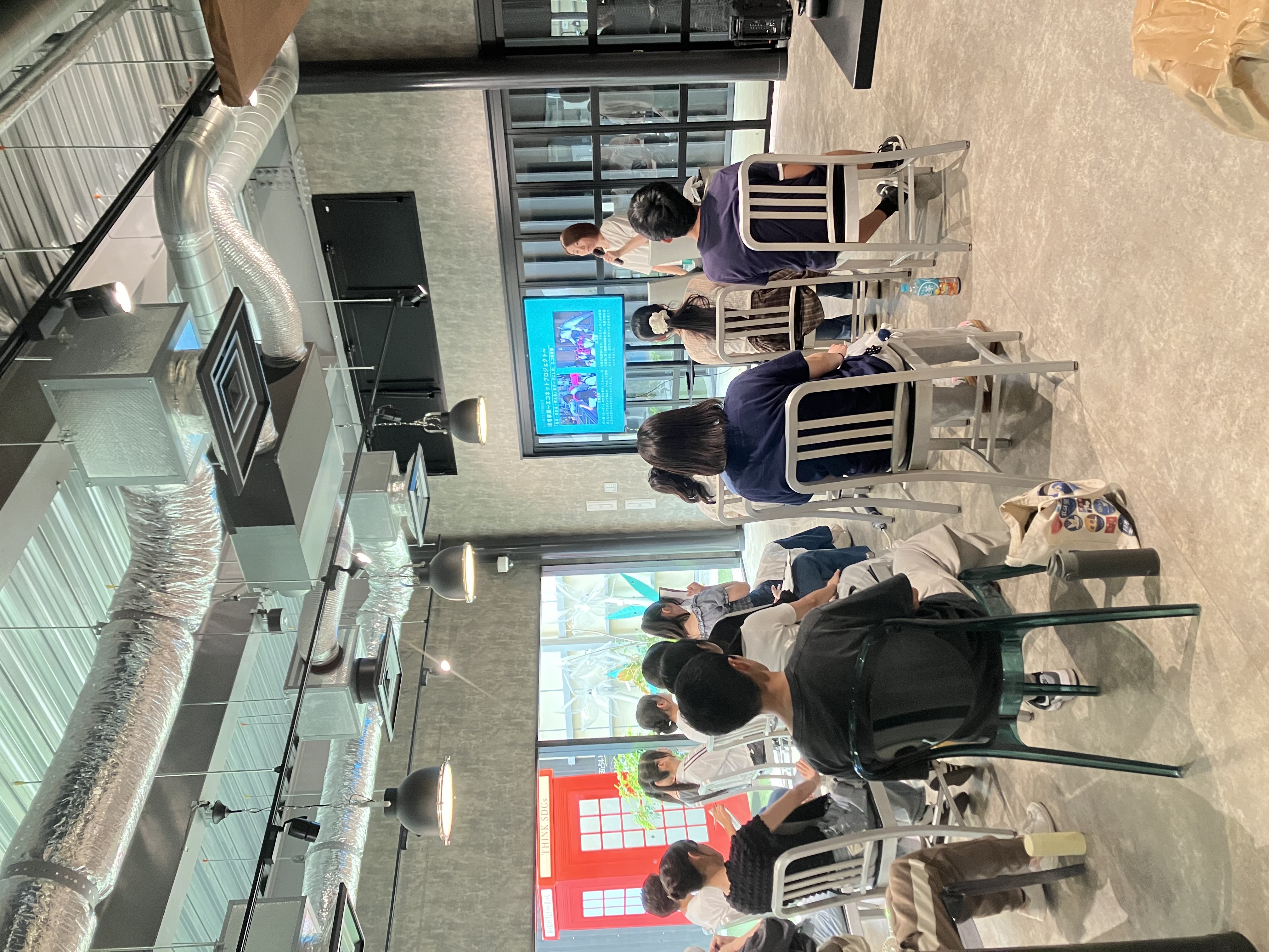 工場見学の後は、1階のカフェスペースにて会社説明と、リサイクルおよび環境問題についてのワークを実施しました。