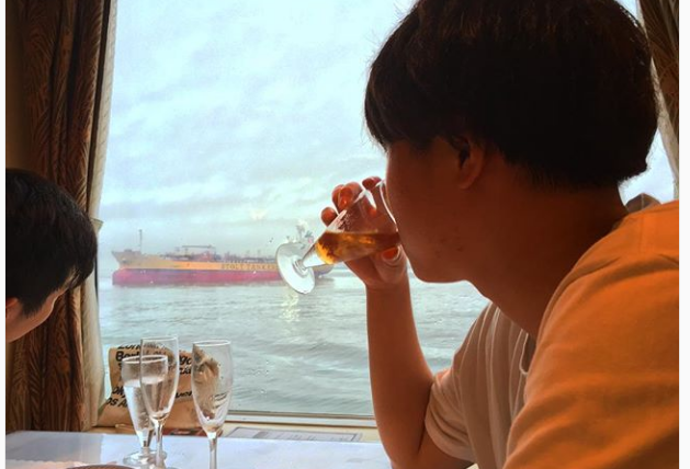 でもそれなりに食事を楽しみ、客船での記念撮影です。